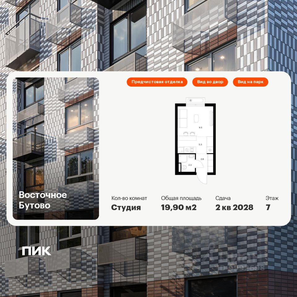 Продаётся квартира-студия площадью 19,9 кв.м на 7 этаже 17 этажного дома (Корпус 48, Секция 1) проекта ПИК Восточное Бутово. Светлый просторный подъезд на уровне земли, функциональная планировка, большие окна, предчистовая отделка.