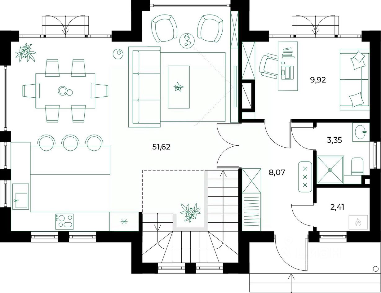 Просторная планировка, современные материалы и панорамные окна.