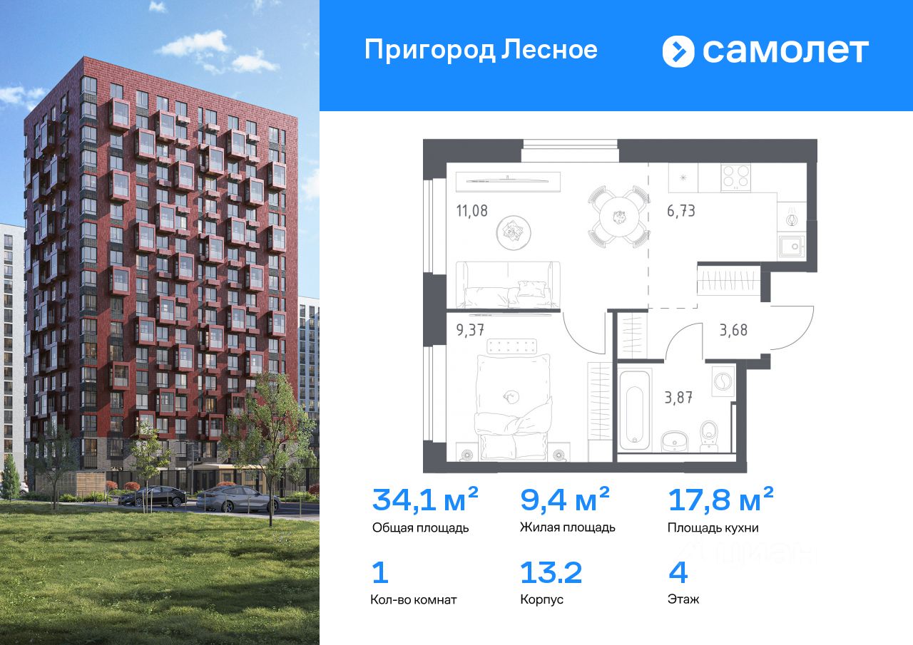 Строим кварталы для жизни с заботой о будущем. Предлагается 1-комнатная квартира комфорт-класса 34,1 кв.м в корпусе 13.2 на 4 этаже, в ЖК ''Пригород Лесное'' Квартира с чистовой отделкой. Доступность дополнительных опций уточняйте у застройщика.