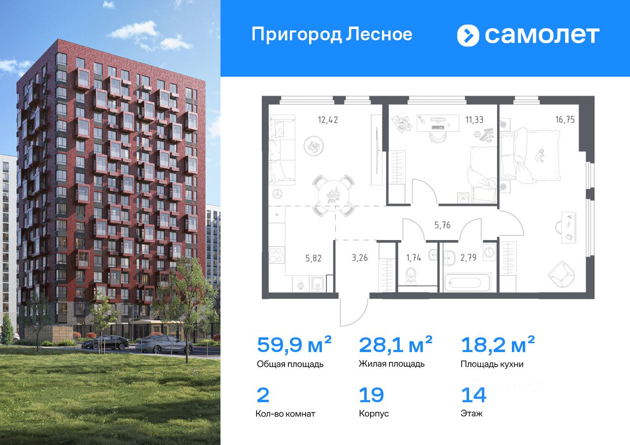 Строим кварталы для жизни с заботой о будущем. Предлагается 2-комнатная квартира комфорт-класса 59,87 кв.м в корпусе 19 на 14 этаже, в ЖК ''Пригород Лесное'' Квартира без отделки. Доступность опции ''отделка'' и возможность комплектации мебелью и декором уточняйте у застройщика.