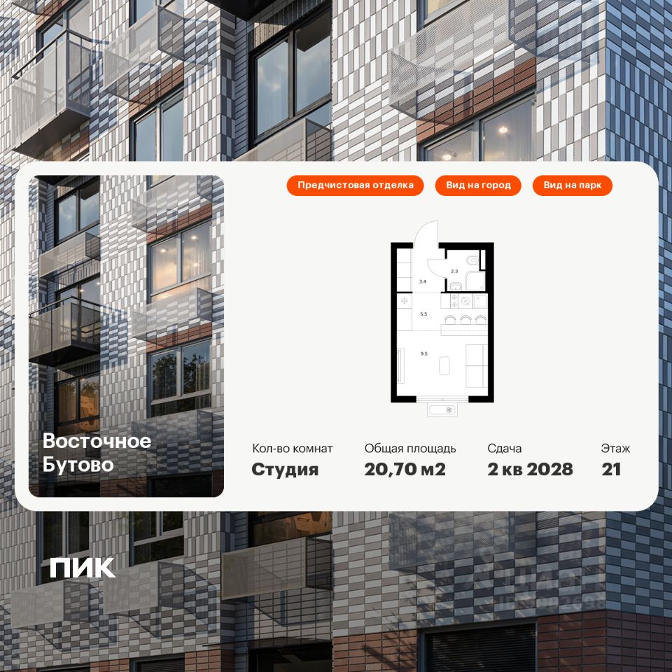 Продаётся квартира-студия площадью 20,7 кв.м на 21 этаже 25 этажного дома (Корпус 48, Секция 4) проекта ПИК Восточное Бутово. Светлый просторный подъезд на уровне земли, функциональная планировка, большие окна, предчистовая отделка.