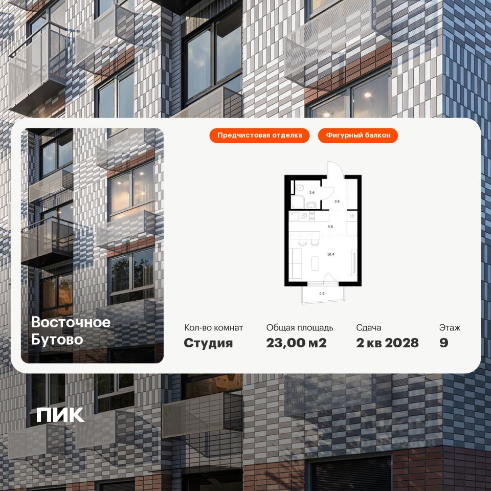 Продаётся квартира-студия площадью 23 кв.м на 9 этаже 25 этажного дома (Корпус 47, Секция 3) проекта ПИК Восточное Бутово. Светлый просторный подъезд на уровне земли, функциональная планировка, большие окна, предчистовая отделка.