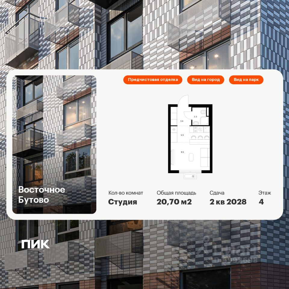 Продаётся квартира-студия площадью 20,7 кв.м на 4 этаже 25 этажного дома (Корпус 48, Секция 4) проекта ПИК Восточное Бутово. Светлый просторный подъезд на уровне земли, функциональная планировка, большие окна, предчистовая отделка.