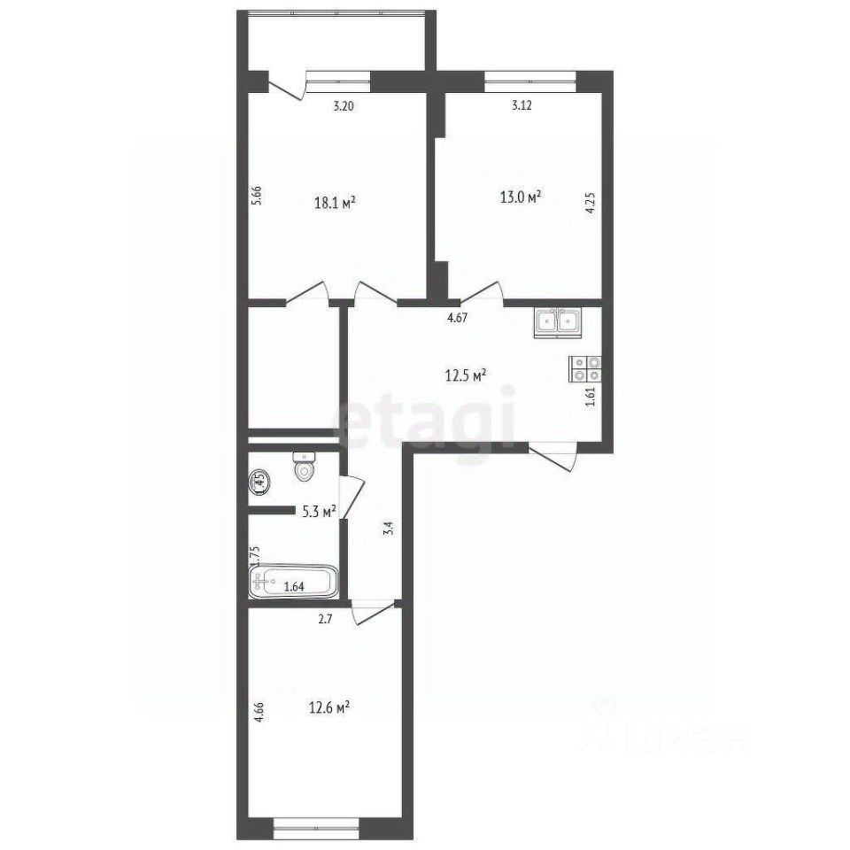 66.5 м² | 3 комнаты | 7 этаж (из 17)