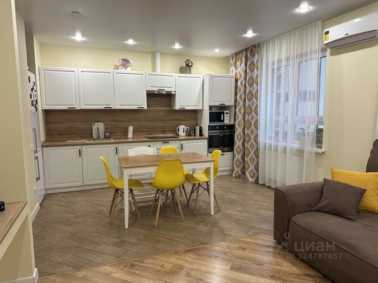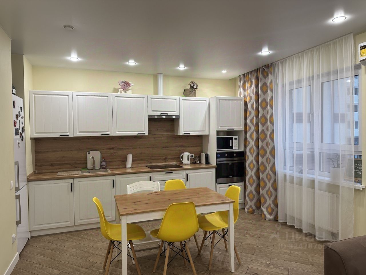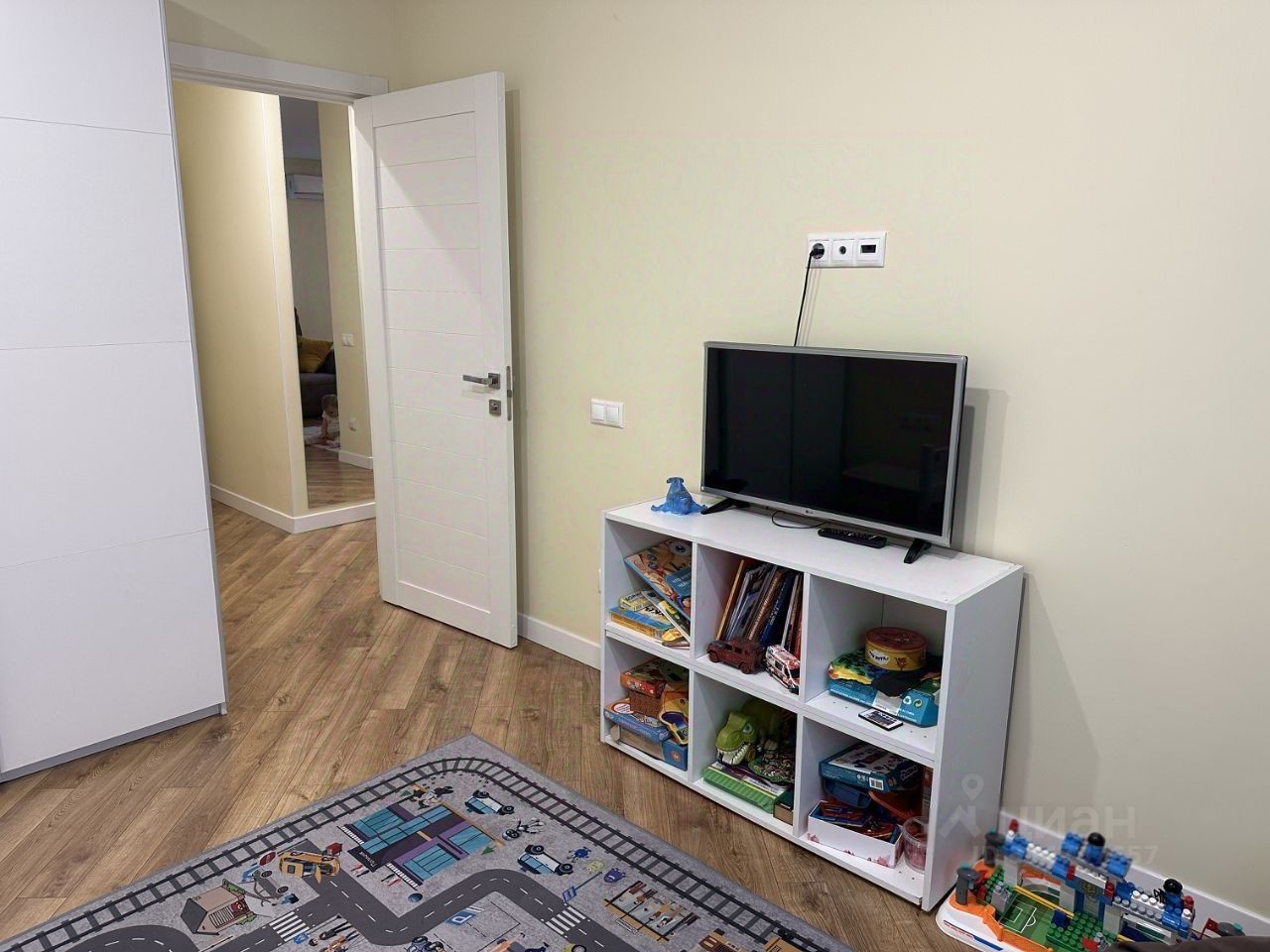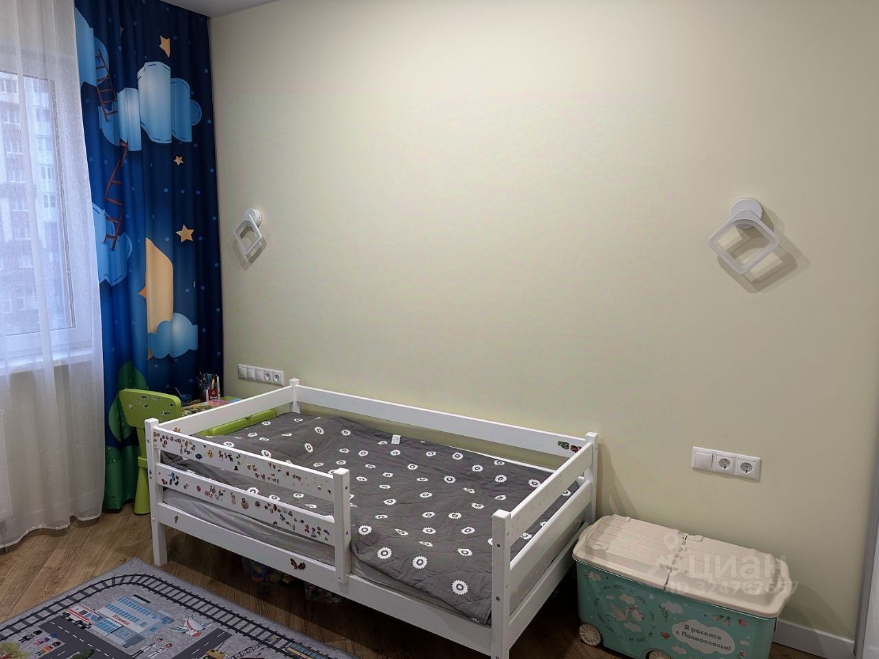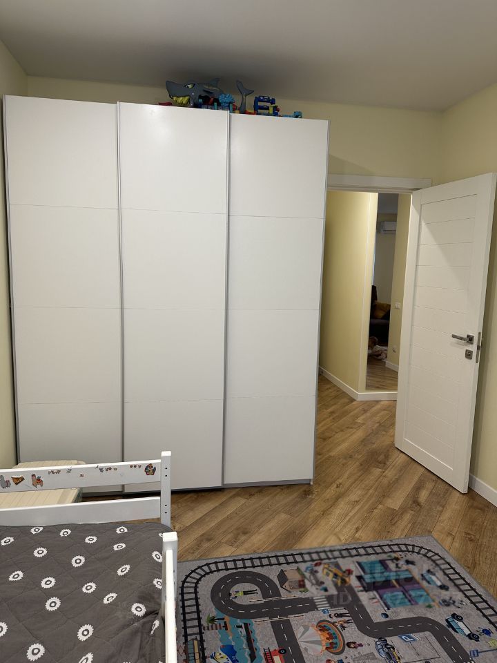 Остается вся мебель, кроме детских кроватей, комода с пеленальным столиком, стеллажа под игрушки. Из техники останется все, кроме микроволновой печи, кофемашины и телевизора в детской комнате.