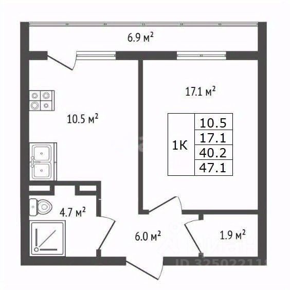 Однокомнатная с большой кухней 10.5 кв. м, общей площадью 47.1 кв. м. Высокий этаж всегда обеспечит много света
