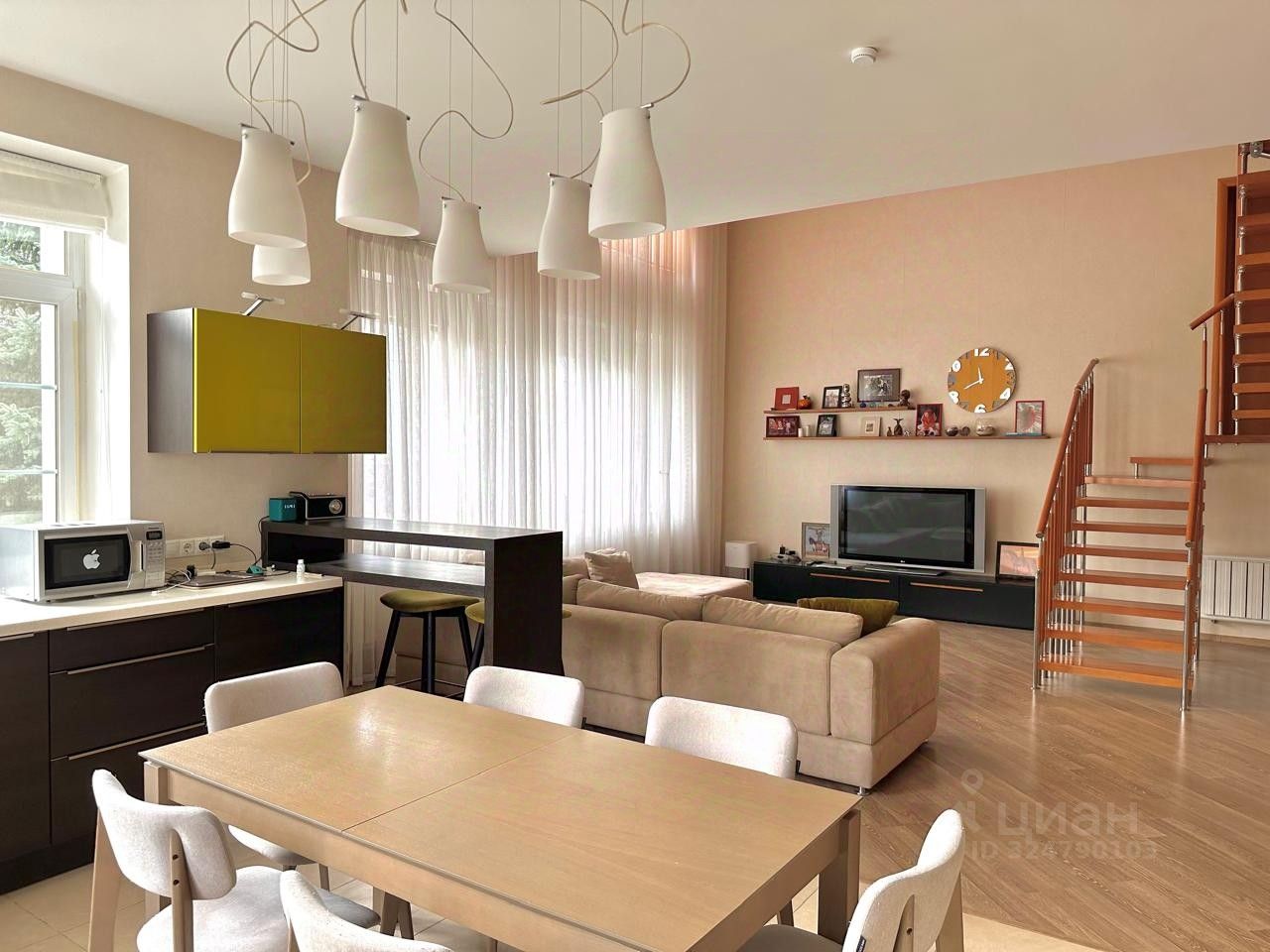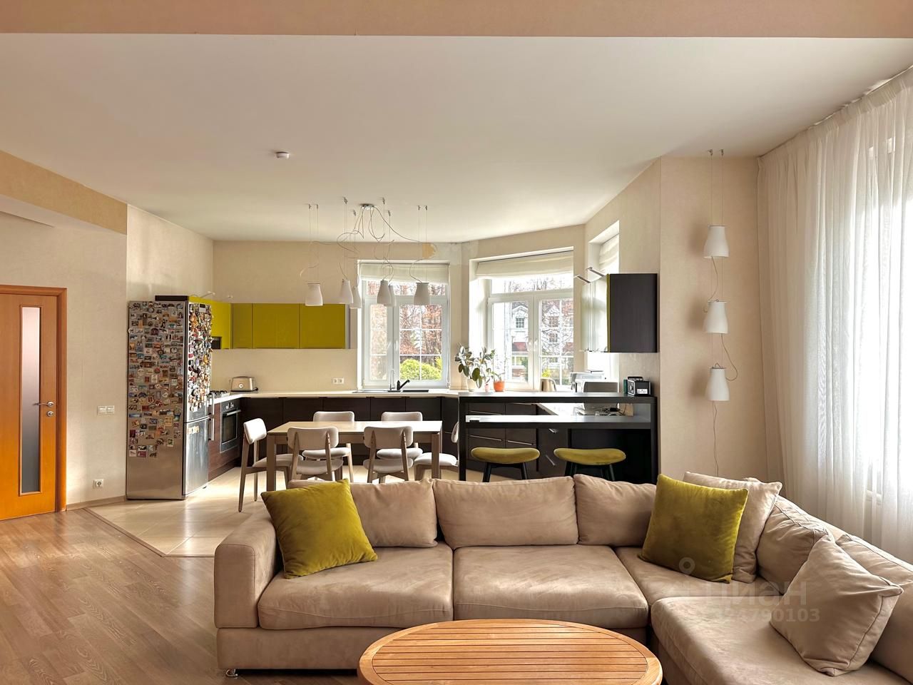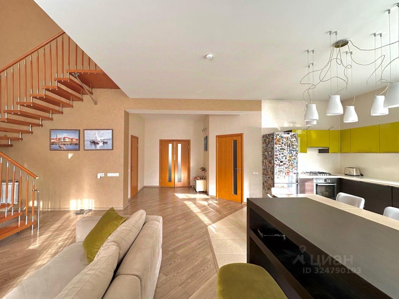 1 этаж - коридор с гардеробной комнатой, двусветная кухня-гостиная потолок 3м и 7м, ванная комната, кабинет.