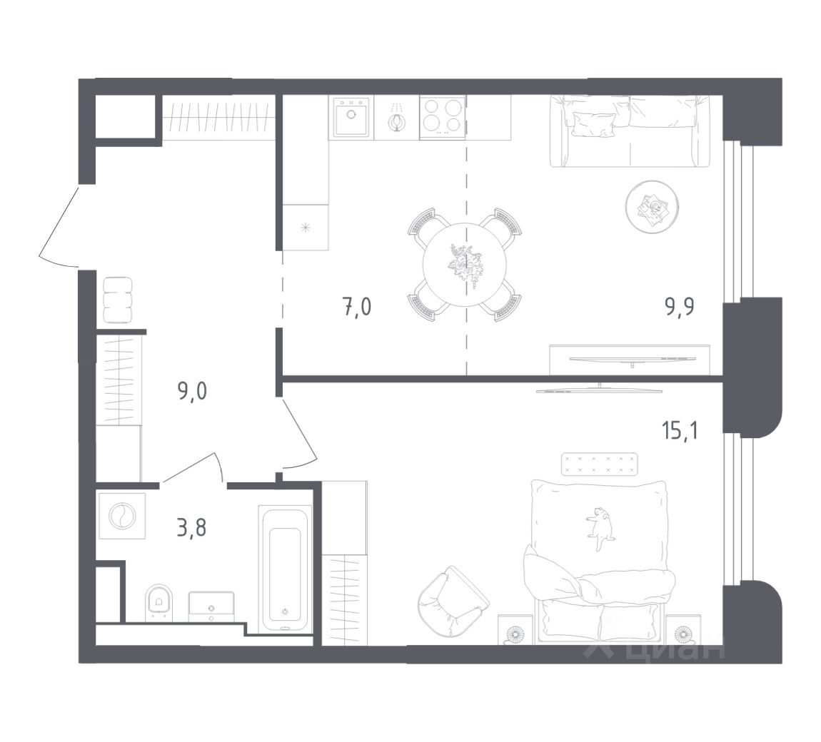 Строим кварталы для жизни с заботой о будущем. Предлагается 1-комнатная квартира бизнес-класса площадью 44,1 кв.м в корпусе 3.1 на 9-м этаже, в жилом комплексе ''Заречье Парк''.