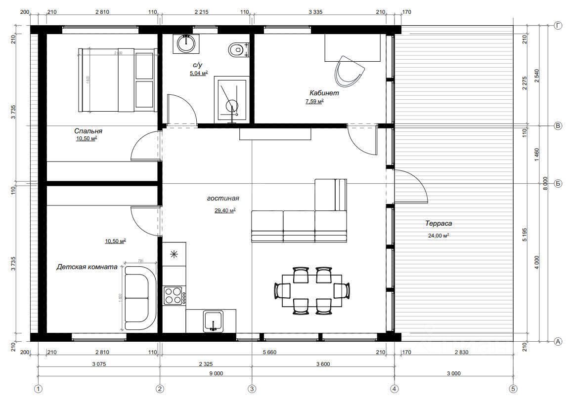 90.5 м2 делятся на просторную гостиную/кухню, две комнаты поменьше, санузел, и небольшую прихожую, которую, впрочем, можно также обустроить под жилое помещение. По сути, это загородная евротрёшка с бонусом. Электричество - 15 кВт, канализация - септик. Вода из скважины, собственная питьевая вода с глубины 90 м. Отопление - конвекторы. Утеплитель- ROCKWOOL Венти Баттс Оптима, с которым конвекторы поддерживают тепло зимой даже в минимальном режиме.