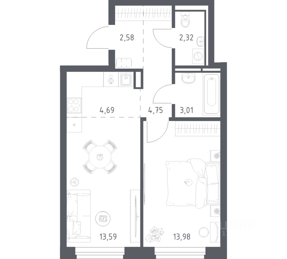 Общая площадь44,3 м2