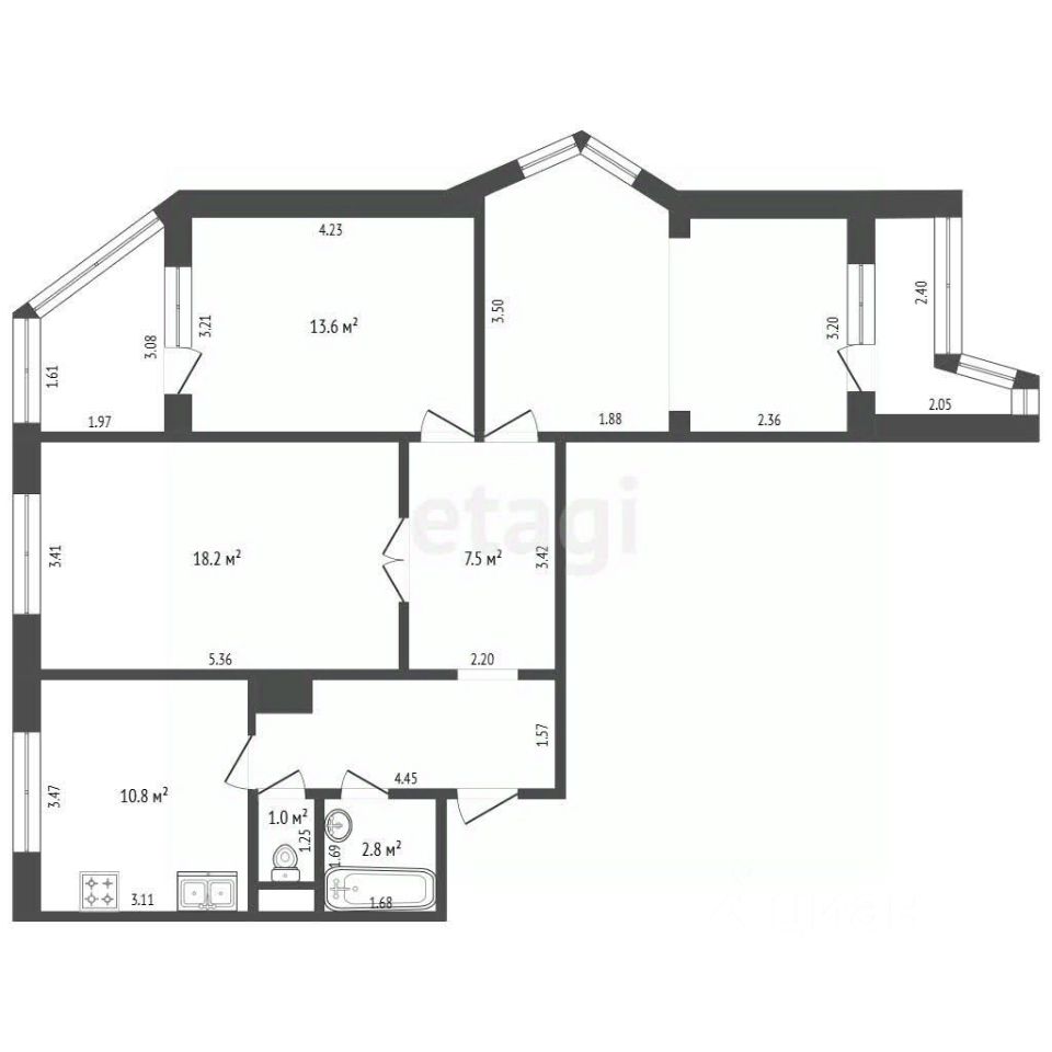 Комфортная планировка квартиры с двумя застекленными лоджиями и эркером, функциональная, позволяющая комфортно разместить большую семью.